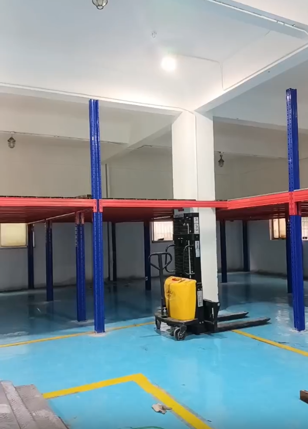 广州白云区阁楼平台货架验收现场视频,存储空间直接翻倍 钢结构平台利用工字钢和冷轧跨梁作为主体支撑加...