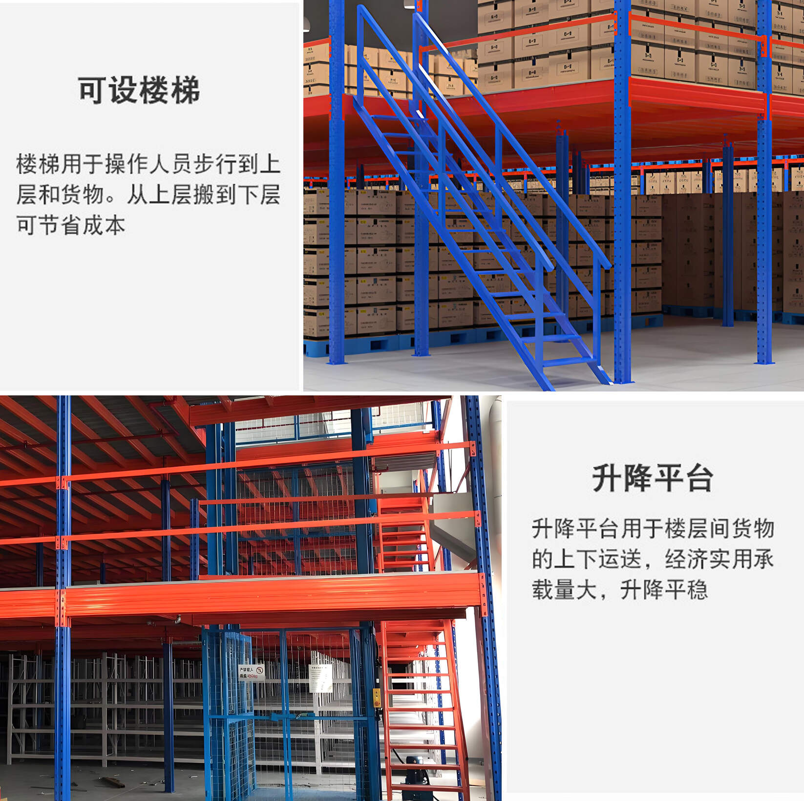 | 可设楼梯 | 楼梯用于操作人员步行到上层和货物,从上层搬到下层可节省成本 |